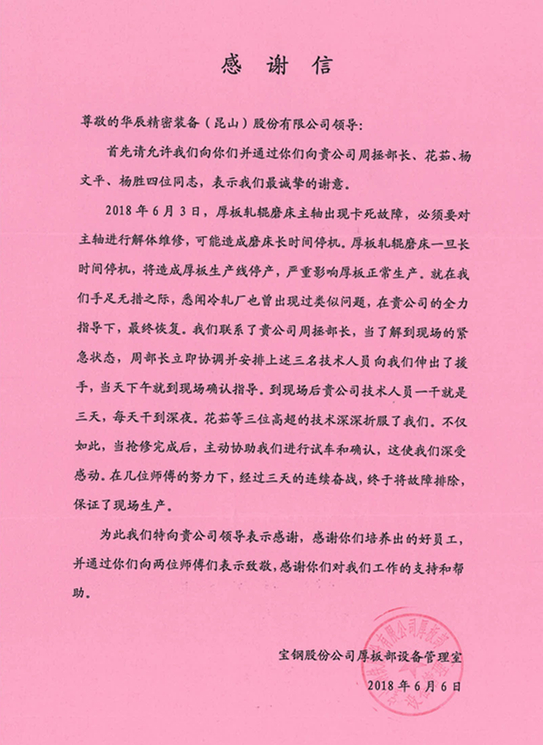 Recently, the heavy plate Department of Baoshan Iron and Steel Co., Ltd. (hereinafter referred to as Baosteel) sent a thank you letter to our company, expressing our sincere thanks for the timely coordination of our leaders, the high professional level of technical personnel and the service concept of customer first.
